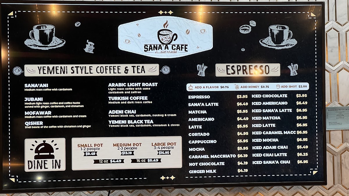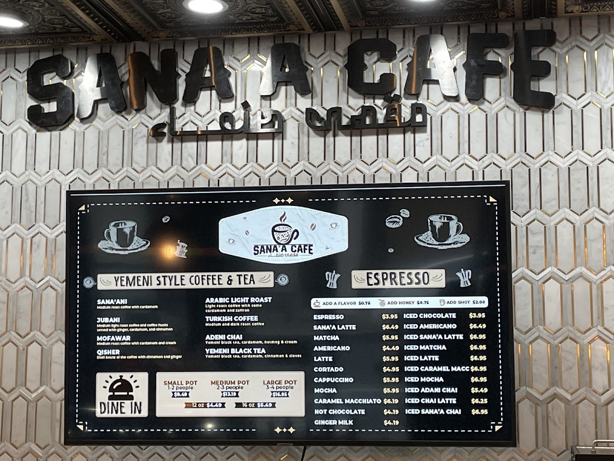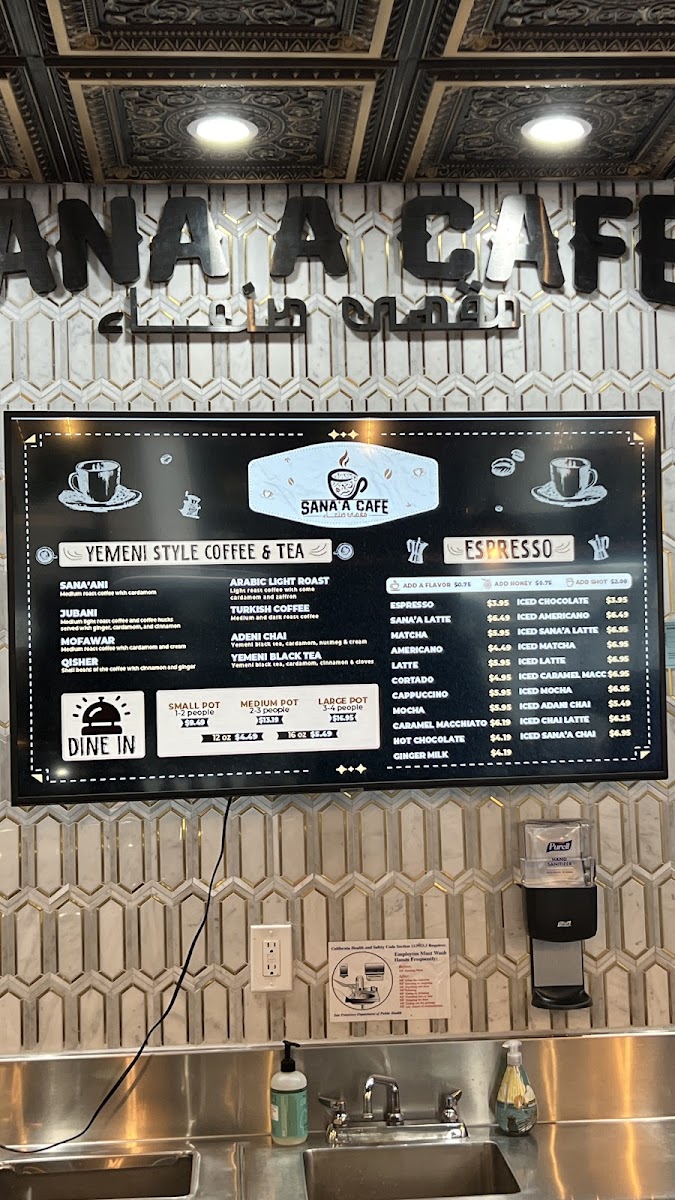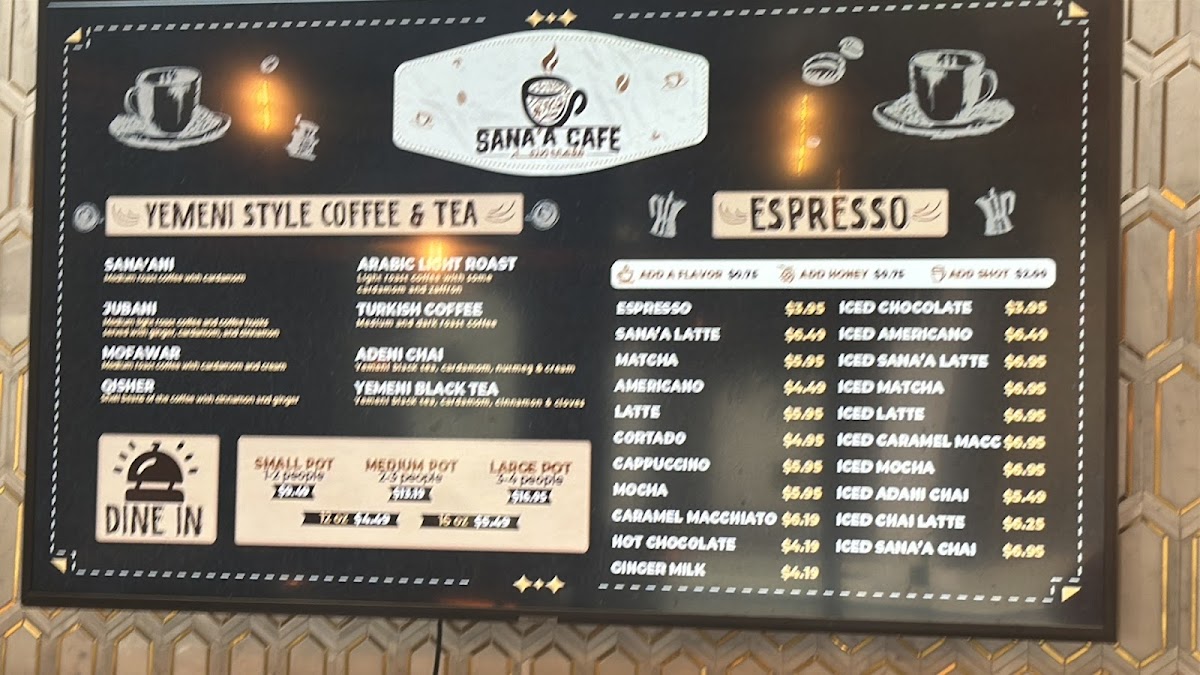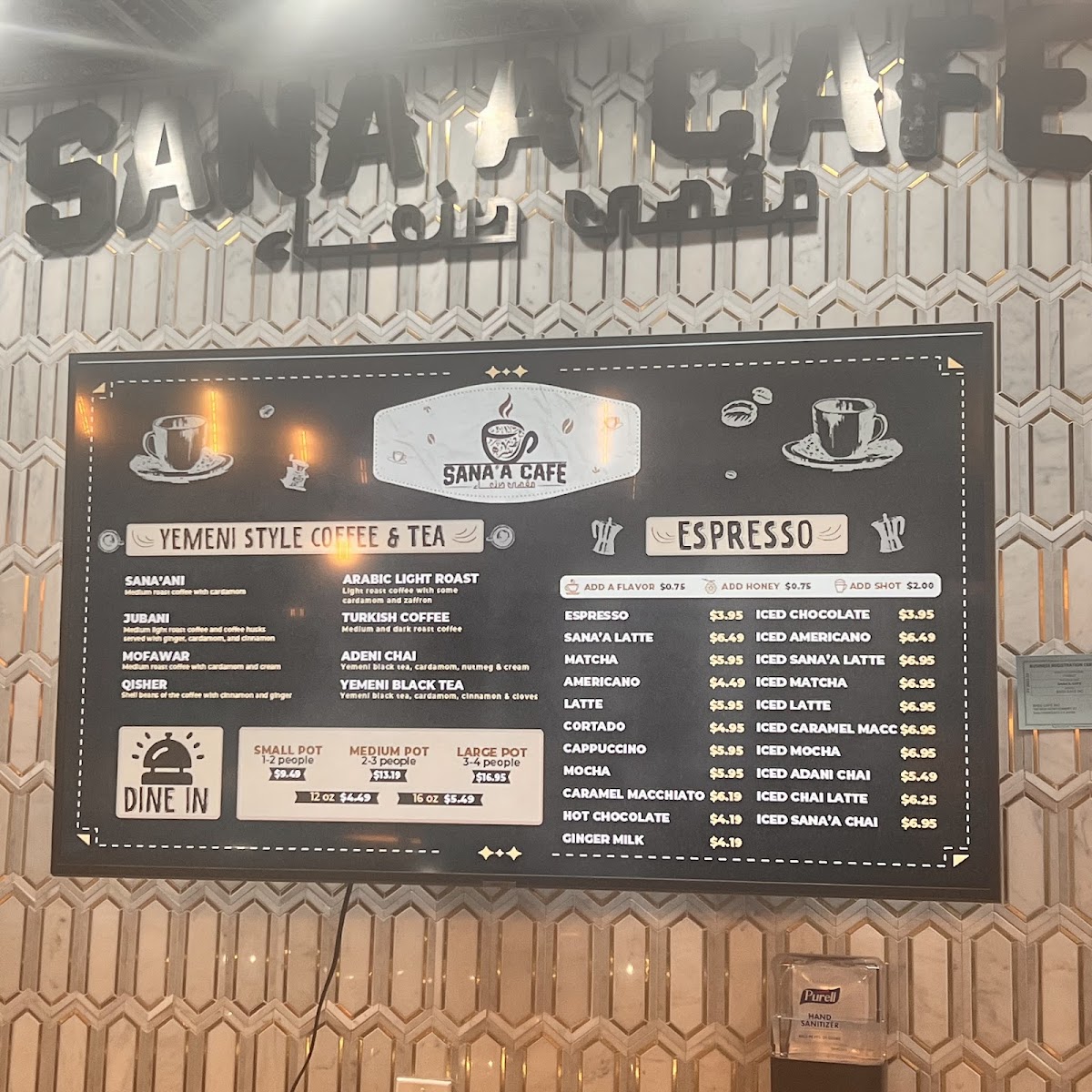 The menu at Sana’a Cafe is organized to offer a variety of beverages and light food options suitable for coffee breaks, casual dining, or light meals. It features a comprehensive selection of hot and iced coffee drinks, including espresso-based options such as lattes, cortados, Americanos, cappuccinos, and mochas, along with specialty items like Sana'a Latte, Yemeni Latte, Pistachio Latte, and Spanish Latte. Cold brews and iced beverages such as iced Yemeni Latte, iced pistachio latte, and iced Sana'ani are also available.